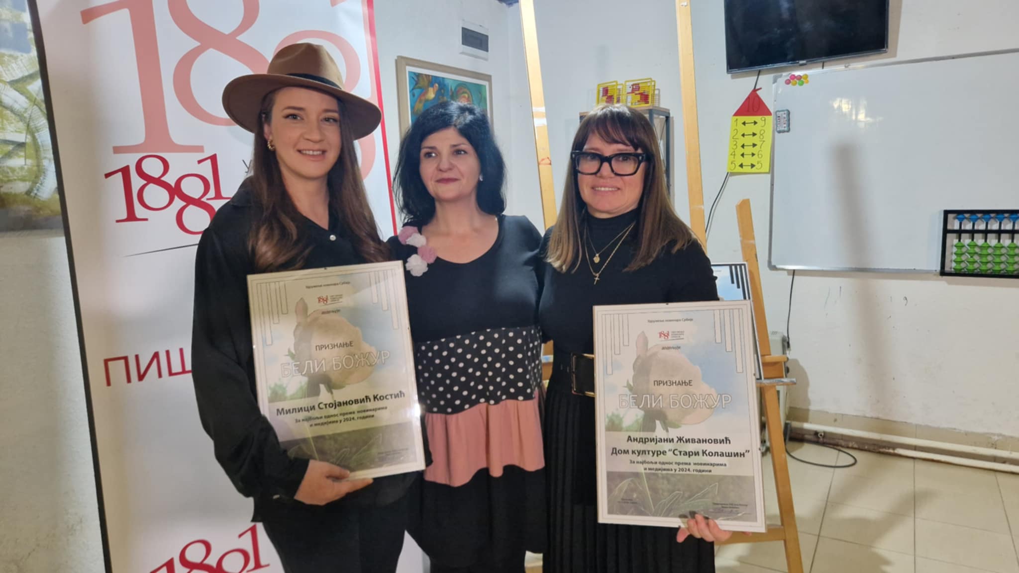 Predsednica Udruženja novinara Srbije na Kosovu Ivana Vanovac uručila je danas priznanje „Beli božur“ za najbolju saradnju sa novinarima i medijima u 2024. godini Milici Stojanović Kostić direktorki organizacije „Pravo na pravo“ i Andrijani Živanović direktorki Doma kulture „Stari Kolašin“ u Zubinom Potoku.