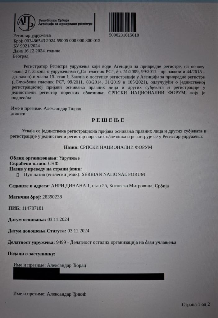Rešenje APR o osnivanju SNF, sa podacima o zastupnicima.
