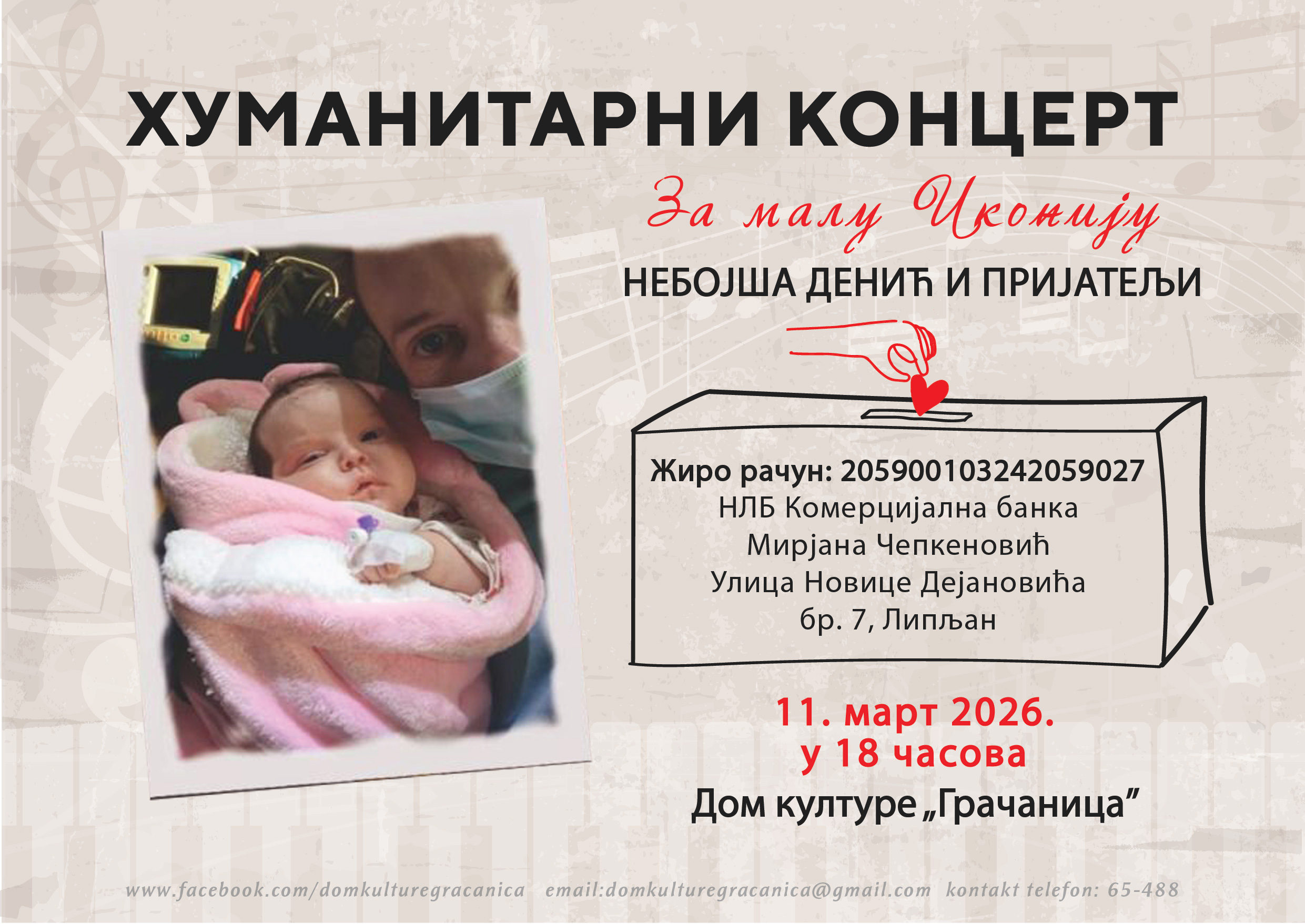 Dom kulture Gračanica poziva na humanitarni koncert pod nazivom „Nebojša Denić i prijatelji“, koji će biti održan u sredu, 11. marta, u 18 časova, sa ciljem prikupljanja pomoći za malu Ikoniju iz Lipljana kojoj je neophodna podrška za lečenje.