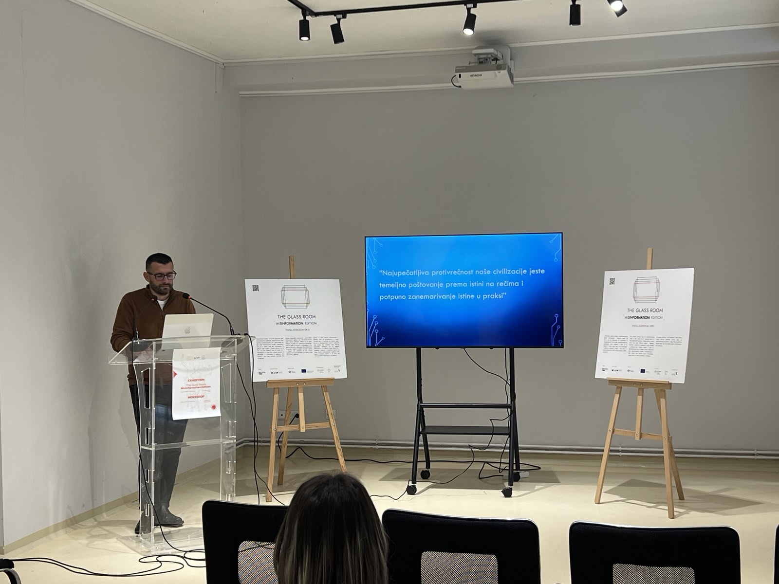 “Cilj je da ukaže upravo na te probleme o kojima sam pričao. Ja sam učestvovao na izložbi u Severnoj Mitrovici, a sada sam i ovde u Gračanici. Ideja je da se kroz multimedijalne postavke pokaže koliko je važno da imamo taj kritički pristup, da proveravamo činjenice i da se na neki način podigne svest o problemu koji je sve više intenziviran kroz različite formate – bilo da se radi o upotrebi veštačke inteligencije i formata poput lažnog videa, lažnog audija, dakle pored audio snimaka imamo i razne objave na društvenim mrežama. Važno je da ljudi imaju više svesti o tome i da znamo materiju problema kako nas bilo koji sadržaj ne bi doveo u određenu zabludu”.
