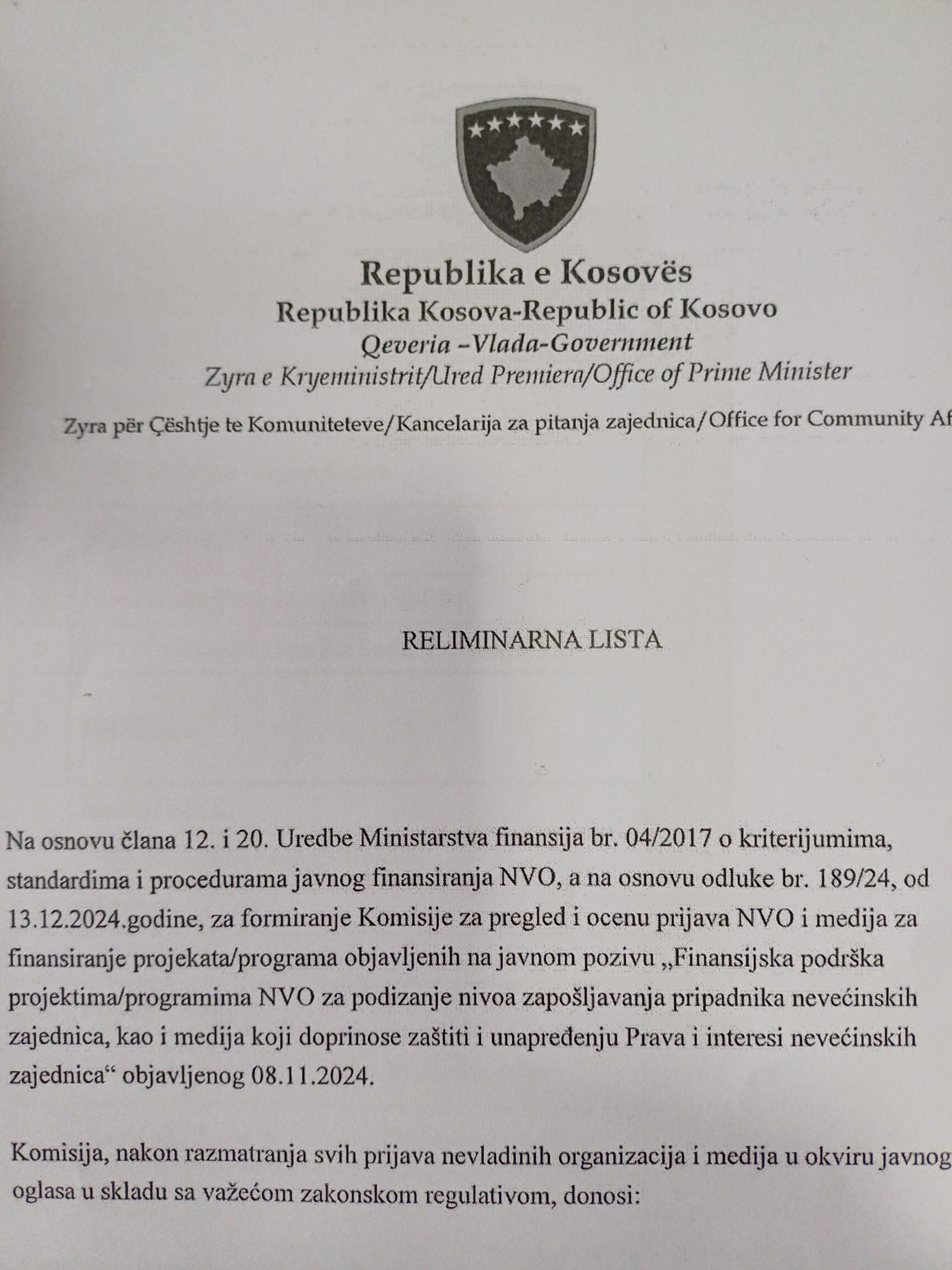 Kancelarija za pitanja zajednica premijera Kosova objavila je preliminarnu listu NVO i medija čiji su projekti podržani od strane komisije za finansiranje u okviru javnog poziva „Finansijska podrška projektima/programima aktivnosti NVO za povećanje nivoa zapošljavanja članova nevećinskih zajednica, kao i medija koji doprinose zaštiti i promociji prava i interesa nevećinskih zajednica na Kosovu“, koji je objavljen 08.11.2024. godine.