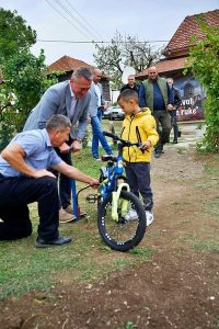 Na jednoj od fotografija objavljenih na Fejsbuk stranici Ministarstva vidi se i trenutak kada Rašić pumpa gumu na biciklu malog Tadije, člana porodice Vulović.