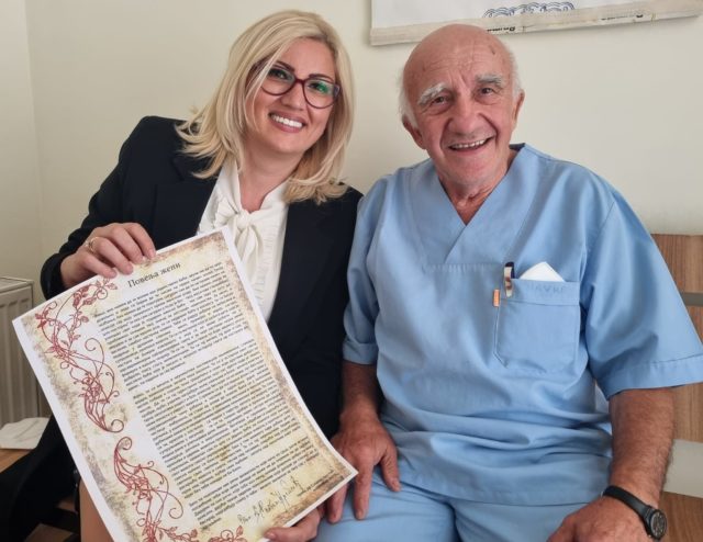 “Poštovani primarijus Slavko je upoznat sa mojim radom i životnom pričom, pa je imao želju da mi uruči priznanje za sve ono što sam kao lekar i žena do sada uspela da uradim za naš narod. Vrlo sam ponosna na činjenicu da čovek koji je uspešno obavio 10000 operacija, 25000 porođaja, blizu milion pregleda, sarađivao sa našim najeminetnijim stručnjacima iz više grana medicine, meni odaje priznanje i daje podstrek da kao žena i lekar nastavim istim putem kao i do sada. Dobila sam Povelju ženi koju je lično on napisao i njegovu knjigu o samoj bolnici u kojoj radi”, napisala je Sonja Ilić Odalović.