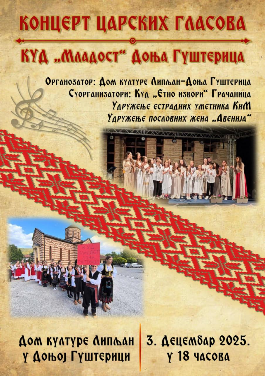 Dom kulture Lipljan-Donja Gušterica najavljuje koncert „Carskih glasova“, koji će biti održan u sredu, 3. decembra, sa početkom u 18 časova, u sali Doma kulture u Donjoj Gušterici.